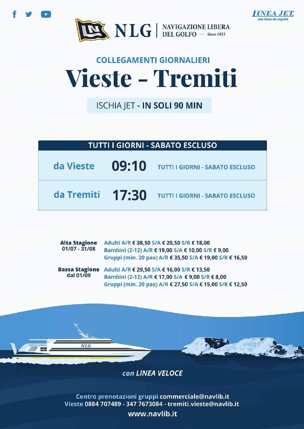 Dal 1° Luglio 2021 ripartiranno i collegamenti giornalieri della linea Vieste - Tremiti (San Nicola) e ritorno; a breve attiveremo la vendita dei biglietti on line su questa tratta