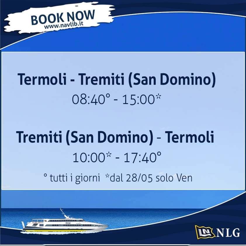 Ricordiamo che, a partire dal 30 Aprile 2021, riprenderanno i collegamenti della linea Termoli - Tremiti (San Domino) e ritorno attivi tutti i giorni.