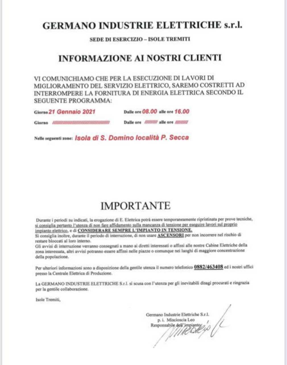 Per la esecuzione di lavori di miglioramento del servizio elettrico.