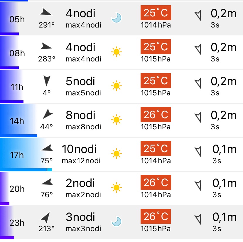 sole tutto il giorno e cielo sereno, vento da nord leggero per tutta lanmattina che tenderà a levante (est) nel pomeriggio.