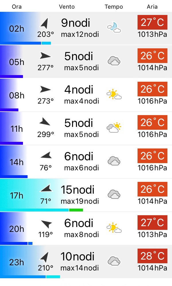 27/07 - cielo coperto a tratti e vento molto variabile durante tutta la giornata. Ponente (ovest) in mattinata poi levante (est) già dal primonpomeriggio verso sera prima scirocco (S/E) e in fine in tarda sera libeccio (S/O)