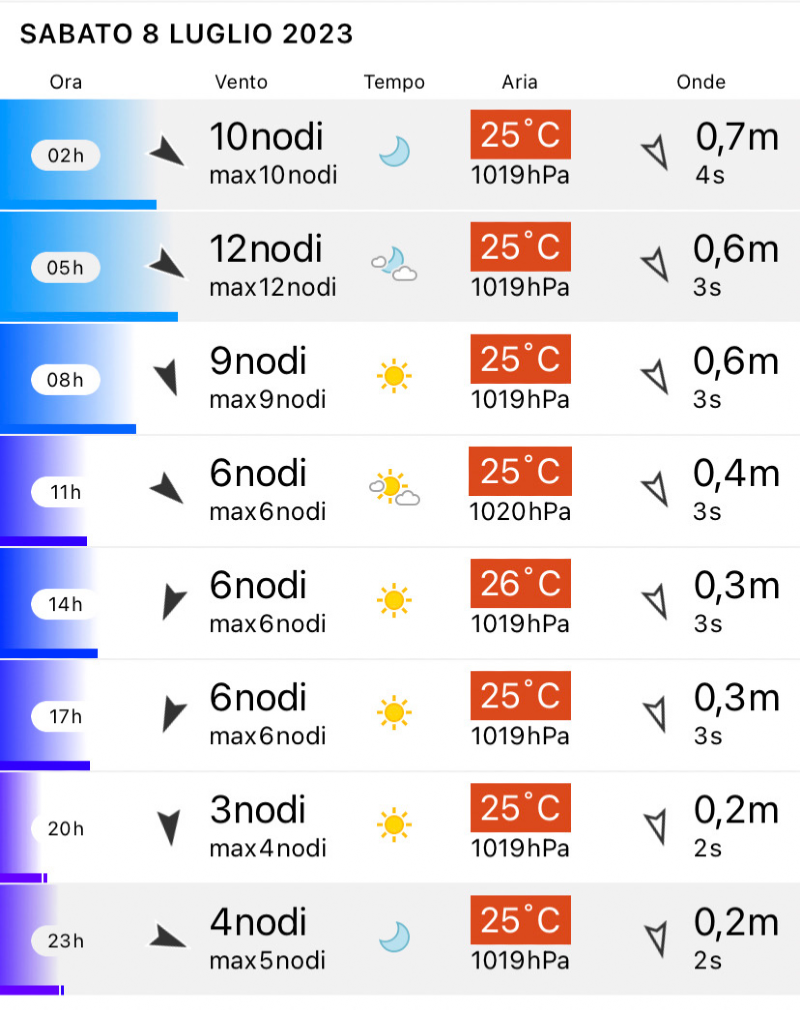 Sole tutto il giorno e vento a bassissima intensità da nord, nord/ovest. giornata calda.