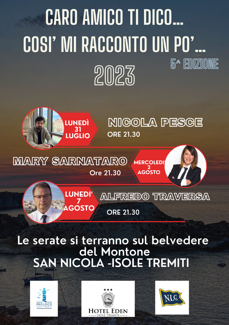 Pro LocoPro Locodi Spano Pia26 lug 2023, 08:36·Post pubblico🥳Anche questa estate la rassegna culturale "Caro Amico ti dico...così mi racconto un po'..." alla sua quinta edizione vi accompagnerà con ospiti speciali🤗🥳5 reazioni5CommentaCondividiMi piace e commenti completi nell'app TremitiNow.