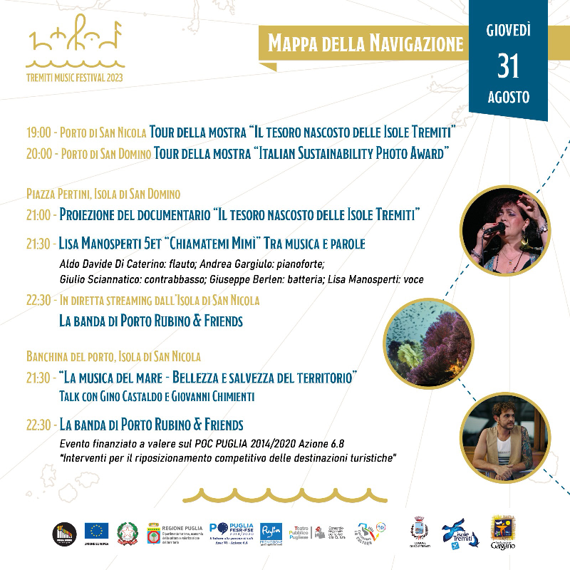 #TremitiMusicFestival รจ promosso da Regione Puglia, Assessorato al Turismo con Pugliapromozione AReT e Teatro Pubblico Pugliese a valere su fondi Por Puglia Fesr-Fse 2014/2020 - Asse VI azione 6.8 - โPalinsesto PP-TPP Puglia - Riscopri la meraviglia 2023โ in collaborazione con il Comune delle Isole Tremiti. Le mostre che arricchiscono questa edizione sono realizzate in collaborazione con Cime.